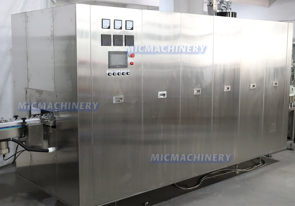 Designed as a large autoclave, the MIC-600S adopts a continuous tunnel process divided into three functional zones: preheating, high-temperature sterilization, and cooling. Stainless steel heating elements and hot air circulation ensure rapid temperature rise and uniform heat distribution throughout the tunnel. During sterilization, temperatures can reach up to 200°C and are maintained for a controlled duration to ensure effective microbial elimination. After cooling, bottle outlet temperatures are stabilized within a controlled range, supporting safe downstream handling and packaging.