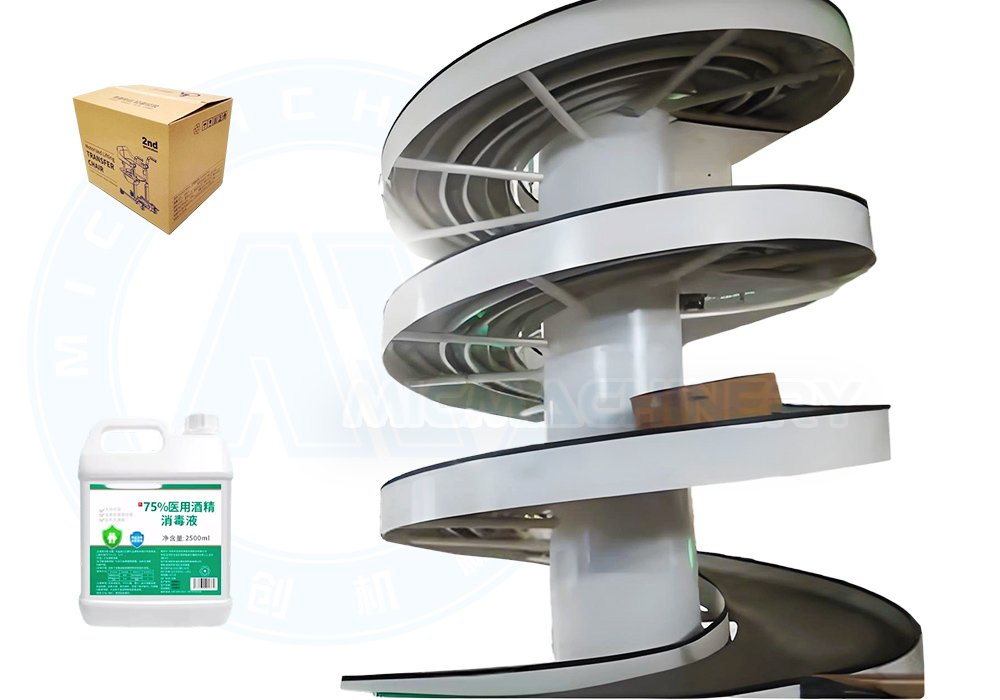 · Spiral and Chain Conveyors: Products are lifted or lowered through a spiral conveyor using POM chain plates with inner bearings, running smoothly on precision tracks for stable vertical transport.