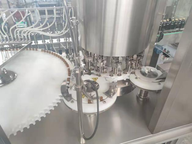 After filling is completed, the bottle is driven by the central large pulley and sent to the transition pulley. Under the driving of the transition pulley, the bottle is automatically capped at the capping station |