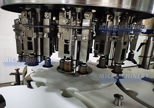The capping section of the 12-head linear filling and capping machine uses a stable, torque-controlled system to securely seal caps at high speed, ensuring tight, reliable closures for bottles of various shapes and sizes. |