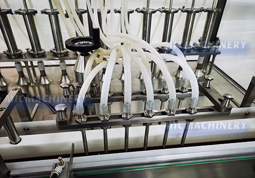 The filling section of the 12-head linear filling and capping machine delivers precise, consistent dosing through synchronized nozzles, ensuring smooth, high-speed operation and clean product transfer for various liquid applications. |